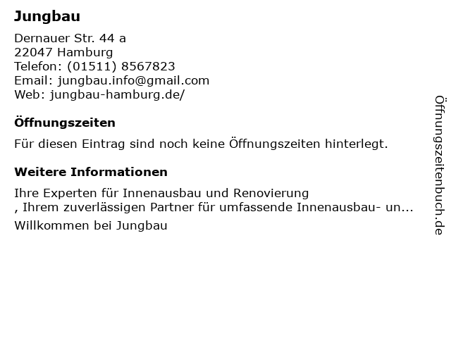 | Öffnungszeiten Jungbau in Hamburg anzeigen | |