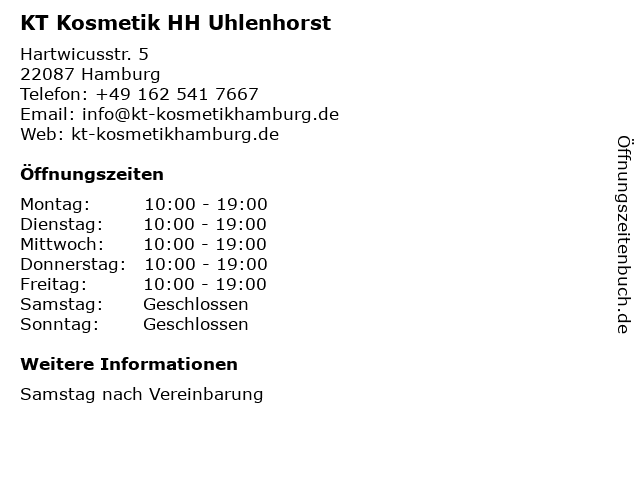 | Öffnungszeiten KT Kosmetik HH Uhlenhorst in Hamburg anzeigen | |