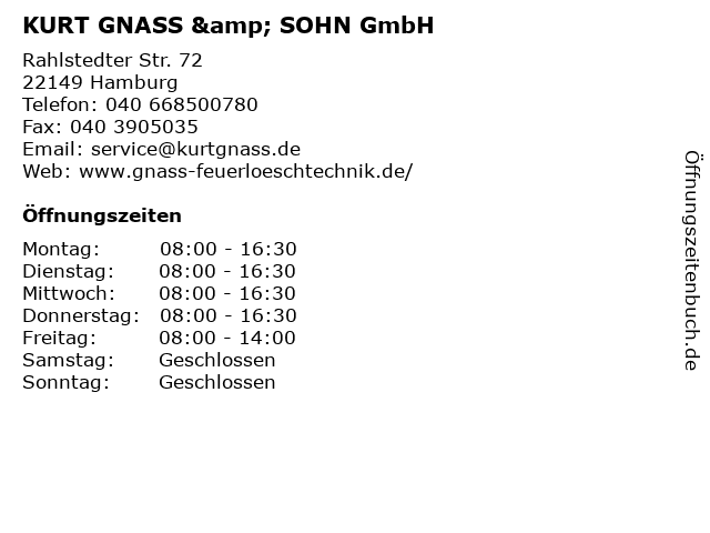 | Öffnungszeiten KURT GNASS & SOHN GmbH in Hamburg anzeigen | |