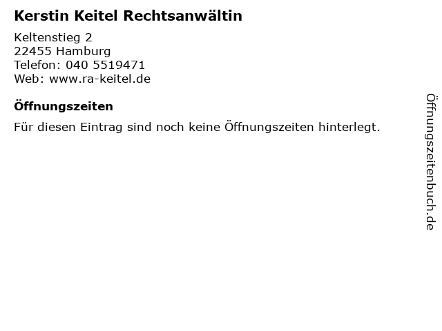 | Öffnungszeiten Kerstin Keitel Rechtsanwältin in Hamburg anzeigen | |