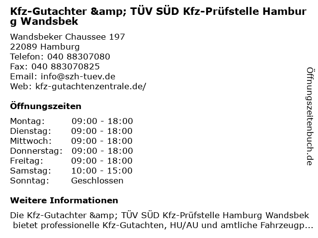 1 TÜV SÜD Kfz-Prüfstelle & Sachverständige - SZH Ingenieurbüro | öffentlich bestellter und vereidigter Sachverständiger (Entfernung: 0,00 km) Wandsbeker Chaussee 197, 22089 Hamburg 5 Vereinigte Hamburger Wohnungsbaugenossenschaft eG Mieterservice Team Süd Hausmeister (Entfernung: 1,37 km) Chapeaurougeweg 28, 20535 Hamburg 6 Postbank-Finanzcenter Hamburg-Barmbek-Süd (Entfernung: 1,45 km) Hamburger Straße 19-47, 22083 Hamburg |