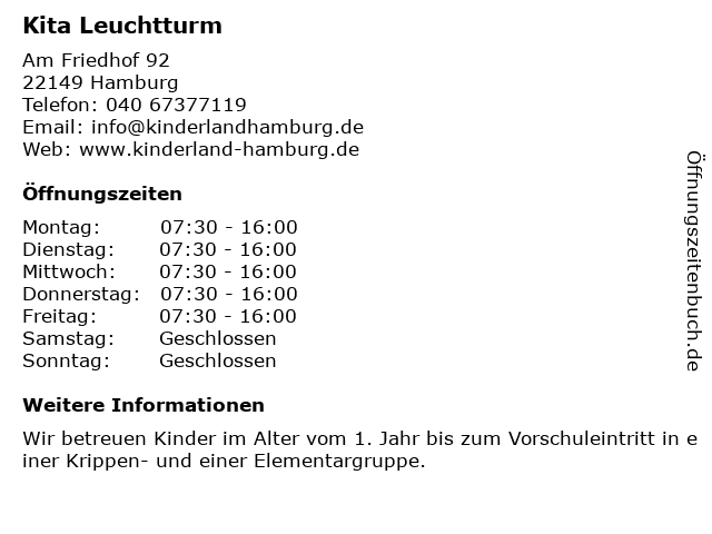 | Öffnungszeiten Kita Leuchtturm in Hamburg anzeigen | |