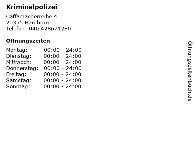 | Öffnungszeiten Kriminalpolizei in Hamburg anzeigen | |