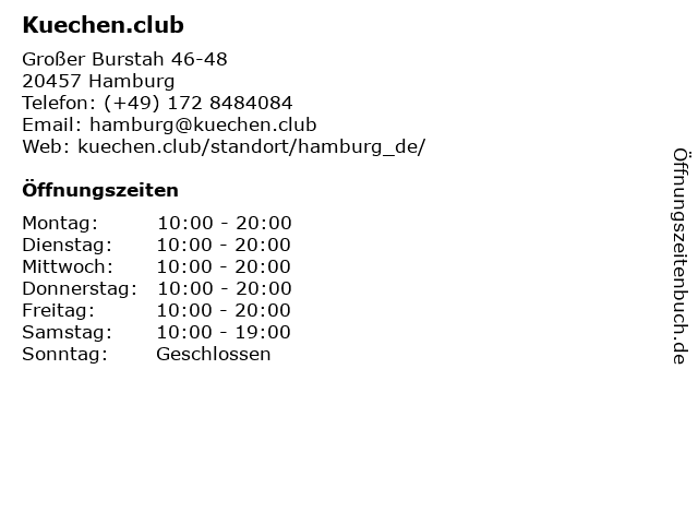 | Öffnungszeiten Kuechen.club in Hamburg anzeigen | |