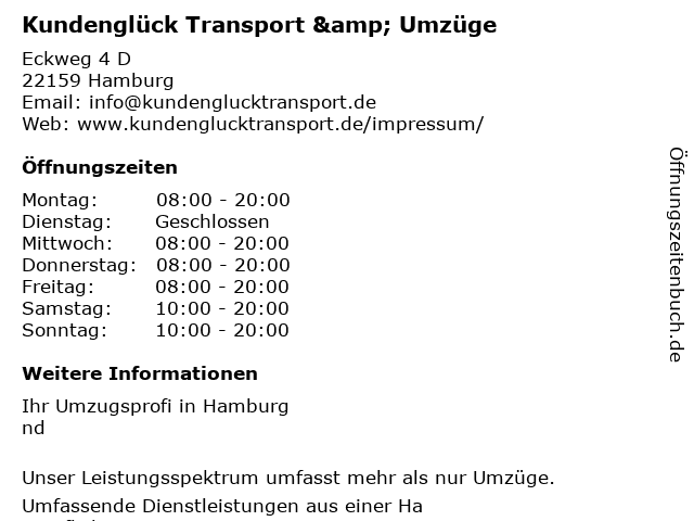 | Öffnungszeiten Kundenglück Transport & Umzüge in Hamburg anzeigen | |