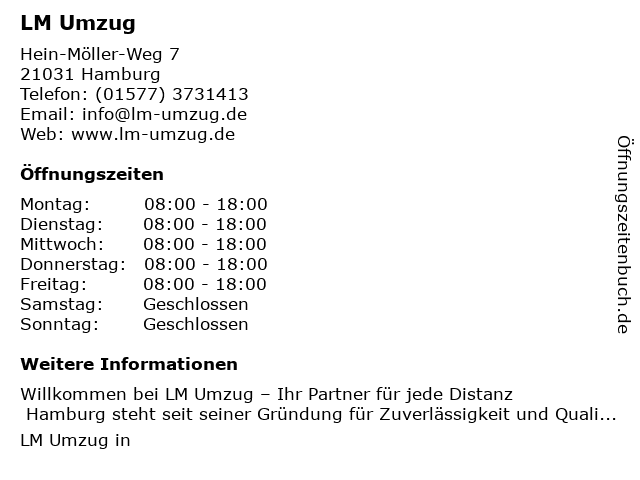 | Öffnungszeiten LM Umzug in Hamburg anzeigen | |