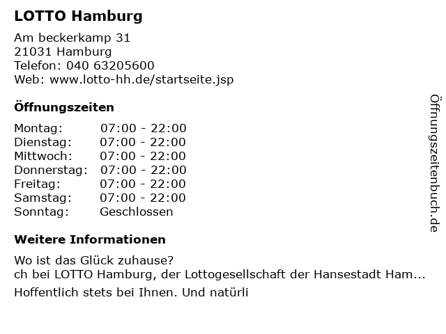 | Öffnungszeiten LOTTO Hamburg in Hamburg anzeigen | |