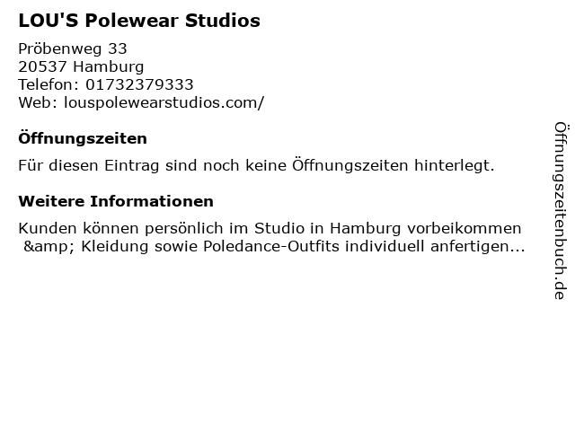 | Öffnungszeiten LOU'S Polewear Studios in Hamburg anzeigen | |