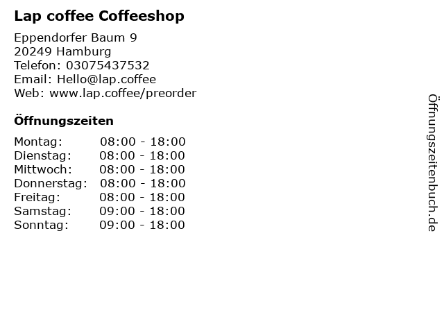 | Öffnungszeiten Lap coffee Coffeeshop in Hamburg anzeigen | |