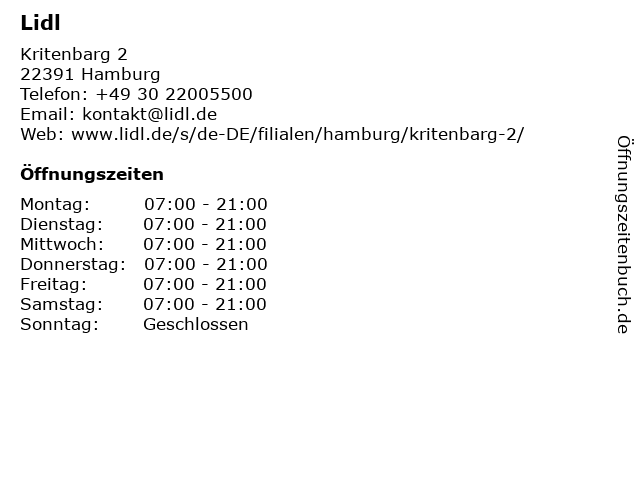 | Öffnungszeiten Lidl in Hamburg anzeigen | |