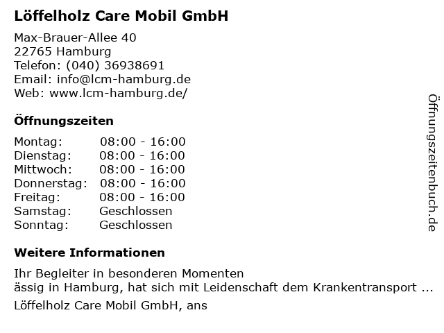 | Öffnungszeiten Löffelholz Care Mobil GmbH in Hamburg anzeigen | |