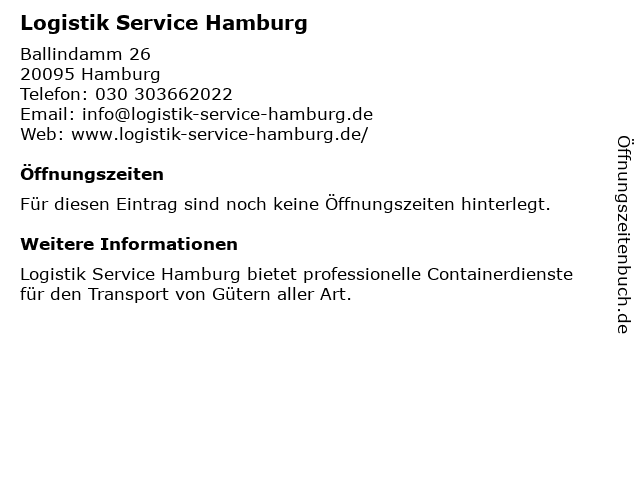 | Öffnungszeiten Logistik Service Hamburg in Hamburg anzeigen | |