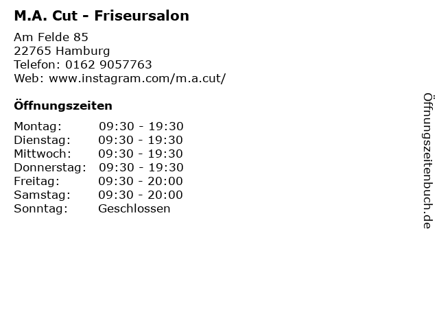 | Öffnungszeiten M.A. Cut - Friseursalon in Hamburg anzeigen | |