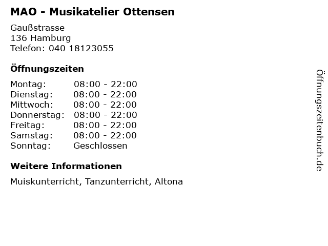 | Öffnungszeiten MAO - Musikatelier Ottensen in Hamburg anzeigen | |