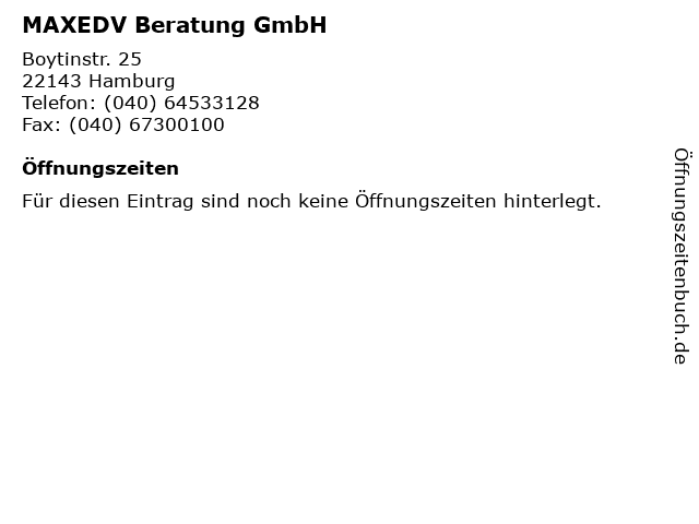 | Öffnungszeiten MAXEDV Beratung GmbH in Hamburg anzeigen | |