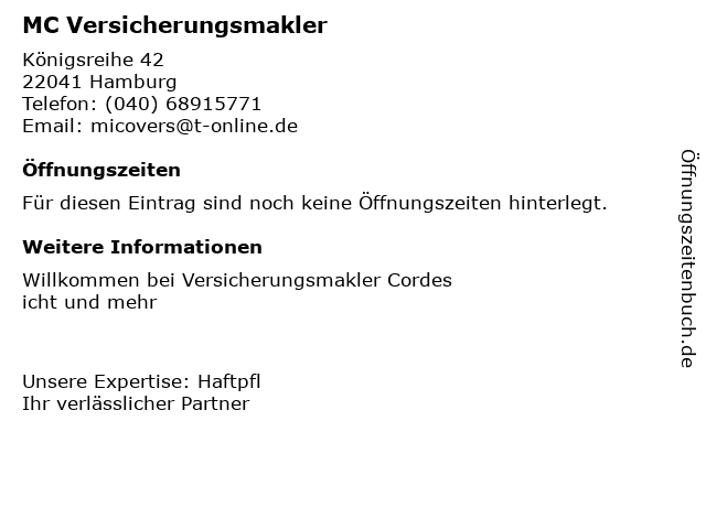 | Öffnungszeiten MC Versicherungsmakler in Hamburg anzeigen | |