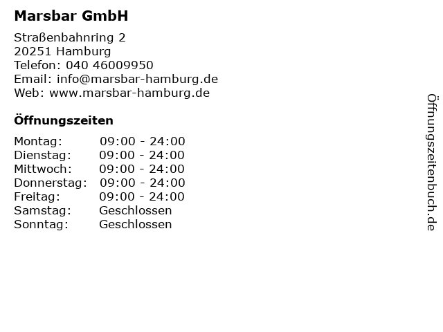 | Öffnungszeiten Marsbar GmbH in Hamburg anzeigen | |