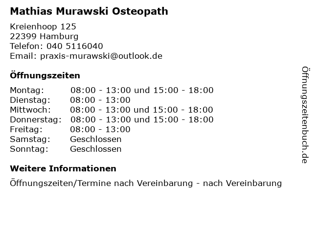 | Öffnungszeiten Mathias Murawski Osteopath in Hamburg anzeigen | |