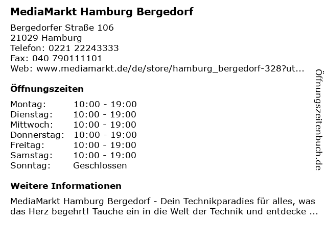 | Öffnungszeiten MediaMarkt Hamburg Bergedorf in Hamburg anzeigen | |