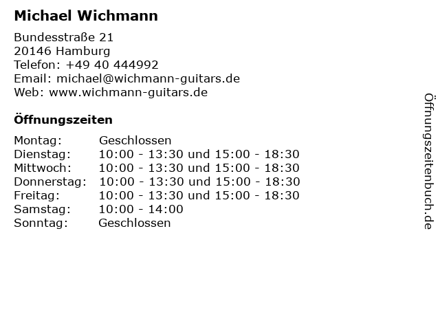 | Öffnungszeiten Michael Wichmann in Hamburg anzeigen | |