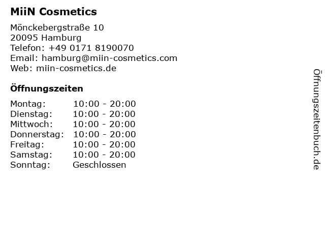 | Öffnungszeiten MiiN Cosmetics in Hamburg anzeigen | |