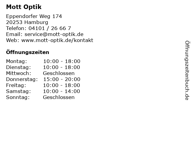 | Öffnungszeiten Mott Optik in Hamburg anzeigen | |