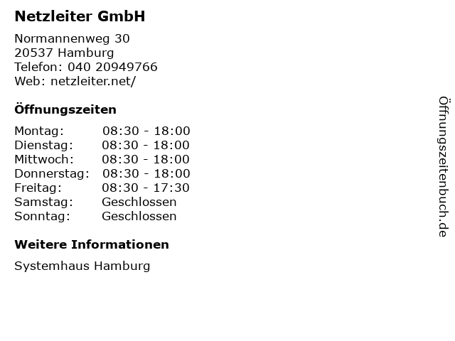 | Öffnungszeiten Netzleiter GmbH in Hamburg anzeigen | |