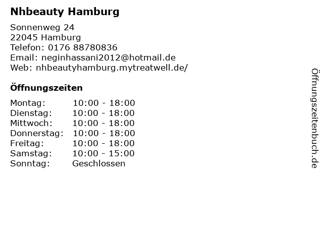 | Öffnungszeiten Nhbeauty Hamburg in Hamburg anzeigen | |