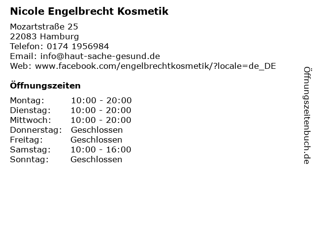 | Öffnungszeiten Nicole Engelbrecht Kosmetik in Hamburg anzeigen | |