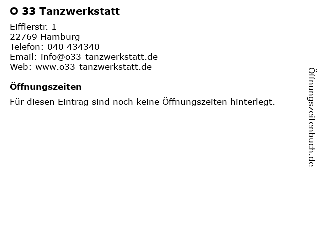 | Öffnungszeiten O 33 Tanzwerkstatt in Hamburg anzeigen | |
