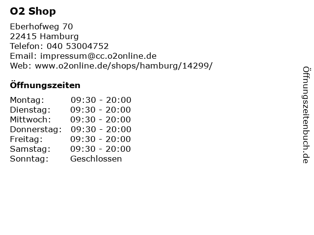 | Öffnungszeiten O2 Shop in Hamburg anzeigen | |