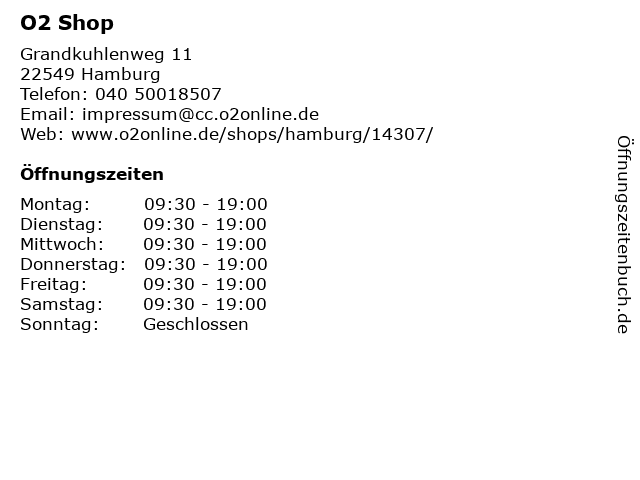 | Öffnungszeiten O2 Shop in Hamburg anzeigen | |