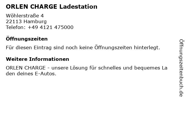 | Öffnungszeiten ORLEN CHARGE Ladestation in Hamburg anzeigen | |