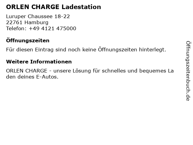 | Öffnungszeiten ORLEN CHARGE Ladestation in Hamburg anzeigen | |