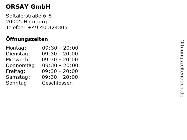 | Öffnungszeiten ORSAY GmbH in Hamburg anzeigen | |