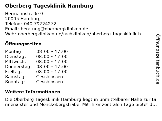 | Öffnungszeiten Oberberg Tagesklinik Hamburg in Hamburg anzeigen | |