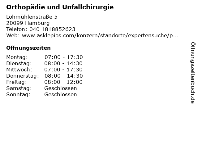 1 Asklepios MVZ St. Georg - Praxis für Orthopädie und Unfallchirurgie (Entfernung: 0,00 km) Lohmühlenstraße 5, 20099 Hamburg 2 Asklepios Klinik St. Georg - Orthopädie - Closed (Entfernung: 0,00 km) Lohmühlenstraße 5, 20099 Hamburg 3 Asklepios Klinik St. Georg - Unfallchirurgie, Orthopädie und Sportorthopädie (Entfernung: 0,01 km) Lohmühlenstraße 5, 20099 Hamburg 4 Dr. med. Walter Petzoldt, Facharzt für Orthopädie (Entfernung: 0,65 km) Armgartstraße 4, 22087 Hamburg 5 Gerald Eggers-Stroeder Facharzt für Orthopädie (Entfernung: 1,68 km) Mönckebergstraße. 18, 20095 Hamburg 6 Dr. med. Holger Molzen Facharzt für Orthopädie Chirotherapie, Sportmedizin Privatpraxis für Privatpatienten und Selbstzahler (Entfernung: 1,72 km) Moorweidenstrasse 4, 20148 Hamburg |