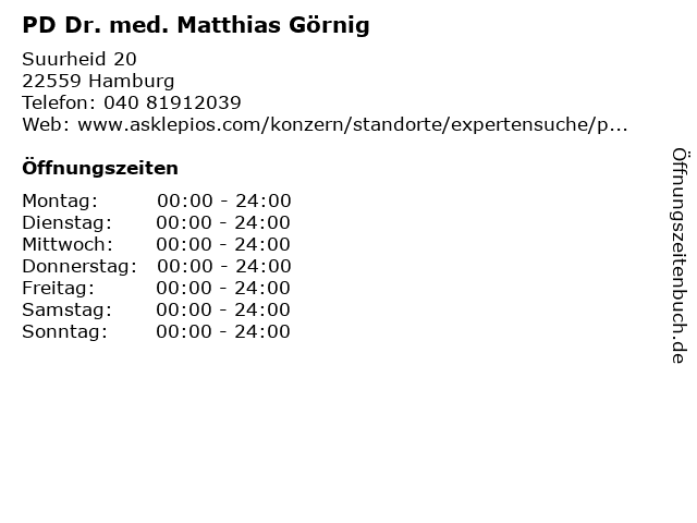 | Öffnungszeiten PD Dr. med. Matthias Görnig in Hamburg anzeigen | |