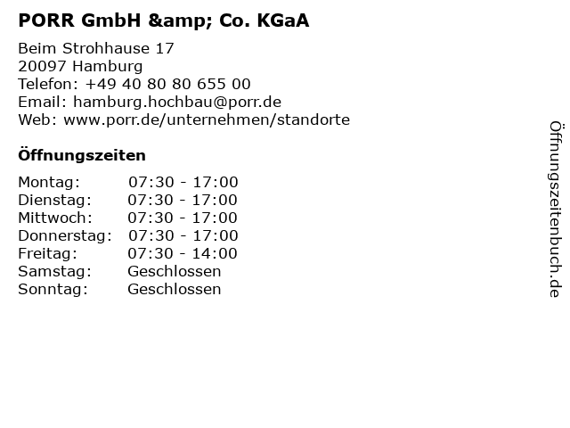 | Öffnungszeiten PORR GmbH & Co. KGaA in Hamburg anzeigen | |