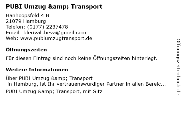 | Öffnungszeiten PUBI Umzug & Transport in Hamburg anzeigen | |