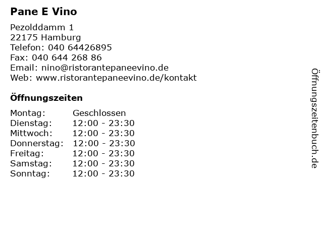 | Öffnungszeiten Pane E Vino in Hamburg anzeigen | |