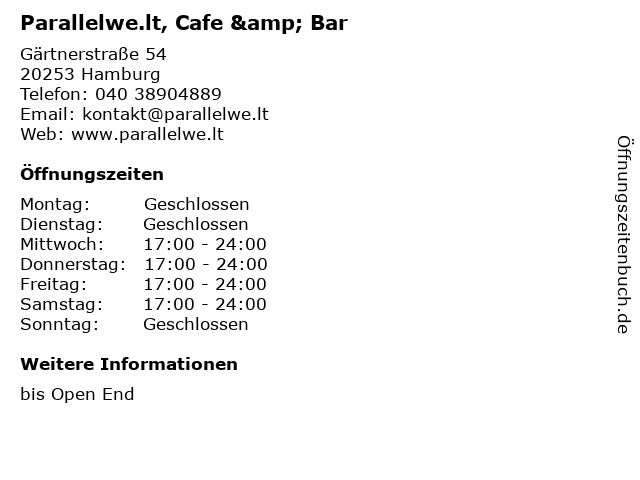 | Öffnungszeiten Parallelwe.lt, Cafe & Bar in Hamburg anzeigen | |
