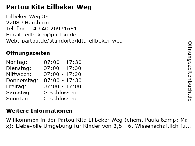 | Öffnungszeiten Partou Kita Eilbeker Weg in Hamburg anzeigen | |