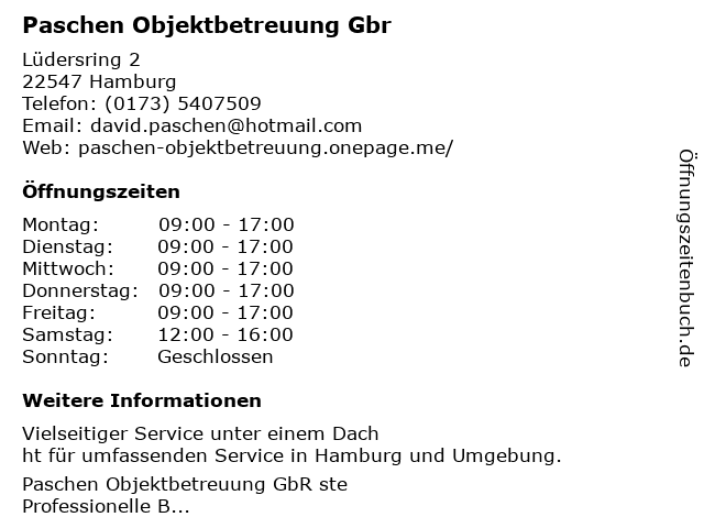 | Öffnungszeiten Paschen Objektbetreuung Gbr in Hamburg anzeigen | |