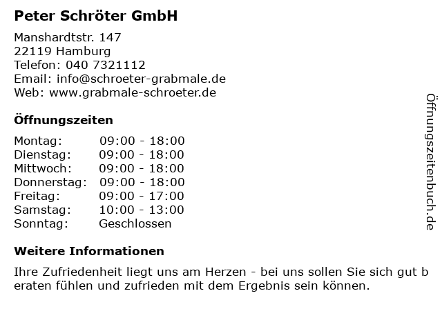 | Öffnungszeiten Peter Schröter GmbH in Hamburg anzeigen | |
