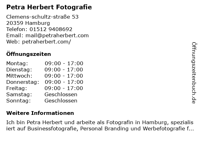 | Öffnungszeiten Petra Herbert Fotografie in Hamburg anzeigen | |