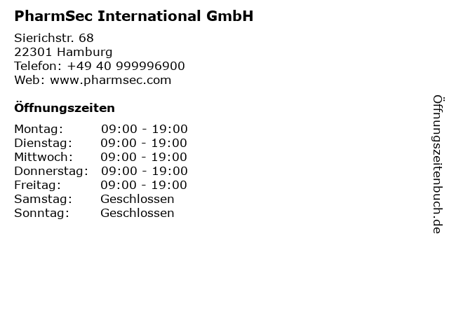 | Öffnungszeiten PharmSec International GmbH in Hamburg anzeigen | |
