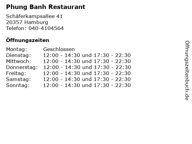 | Öffnungszeiten Phung Banh Restaurant in Hamburg anzeigen | |