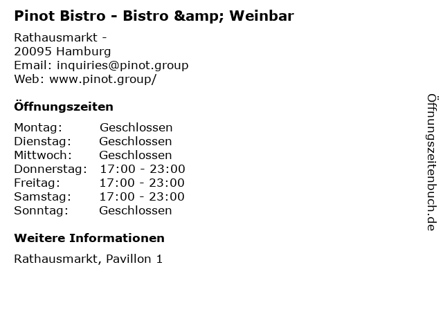 | Öffnungszeiten Pinot Bistro - Bistro & Weinbar in Hamburg anzeigen | |