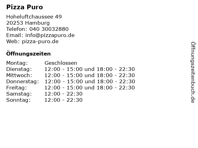 | Öffnungszeiten Pizza Puro in Hamburg anzeigen | |